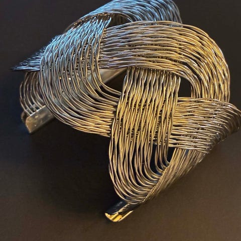 Armbånd med gullbelagt overflate. Åpent, stivt design med to kryssende bøyler som gir et geometrisk uttrykk.