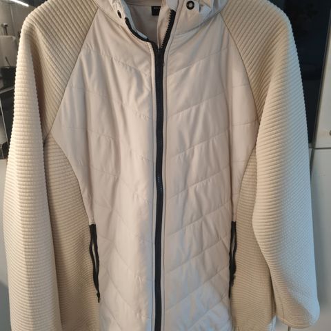 Kari Traa hettegenser for dame i størrelse M. Genseren er i ullmateriale / polyester og har et flerfarget design med lys vindtett front og ermer kombinert med mørkere rygg i fleece og hette. Forstykket har vattert felt, mens ermene har strikket struktur med ribbekanter. Hetten har snøring for justering. Passer til hverdagsbruk og som mellomlag på kjølige dager.