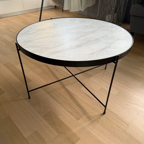 Et lite og elegant bord med vendbar plate som kan brukes til sofabord eller et sidebord. Det er et lite hakk i siden med marmorlaminat. Ellers vingler beina litt når det ikke står på et støttende gulvteppe, Selges som det er!