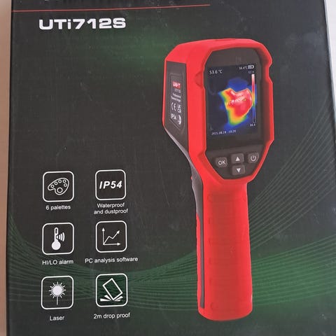 Temperaturområde er oppgitt til mellom -50 °C og 500 °C. Enheten kan vise temperatur i både °C og °F. Automatisk avstenging bidrar til å spare batteri. Batterier følger med i pakken ifølge esken.