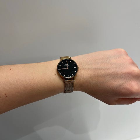 Mockberg dameklokke med sølvfarget lenke og rund urskive. Klokken har analog visning med markerte timemarkører. Klokken er nesten ikke brukt, men selges billig da den må ha nytt batteri