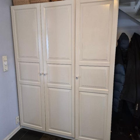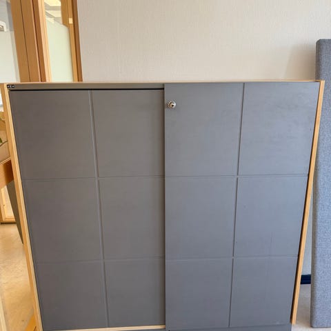 Skap med glassdører og to hyller øverst. I underdelen er det to skap med tre hyller i hvert skap som kan justeres. Gis bort og kan hentes i Ski sentrum.