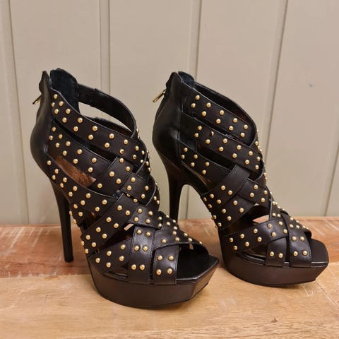 Bianco hæler i størrelse 36. Skoene er svarte med høy hæl og platå foran. Overdelen har flere brede stropper dekorert med små pyntesteiner. Ankelrem med spenne og ekstra lange remmer som kan surres rundt ankelen eller leggen. Såle i syntetisk materiale. Passer som pene sko til bruk ved anledninger der man ønsker høye hæler med dekorative detaljer.