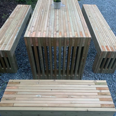 Dette solide utebord- og benkesettet er bygd for å vare. Laget av trykkimpregnert treverk av god kvalitet, tåler det helårsbruk utendørs og holder seg både sterkt og stabilt over tid. Det rene og moderne spile-designet gir et tidløst uttrykk som passer like godt i hagen som på terrassen eller i utestua.