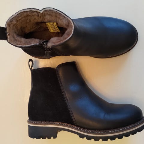 ankelstøvletter i størrelse 36. Skoene er svarte med grov såle og glidelås på siden. Egnet til hverdagsbruk i kjøligere vær.