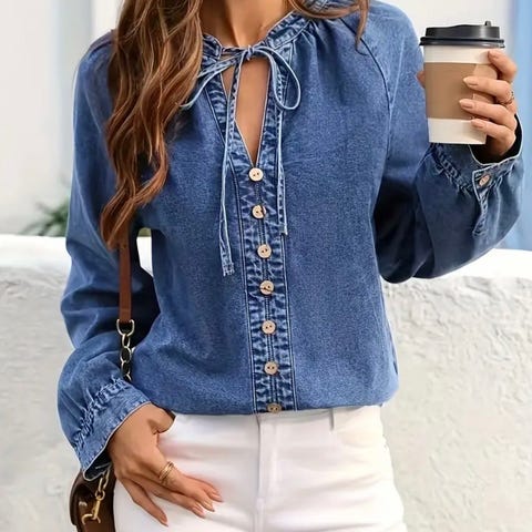 Superfin denimskjorte med feminine volangdetaljer over bryst og skuldre. Klassisk blå vask med trykknapper foran.