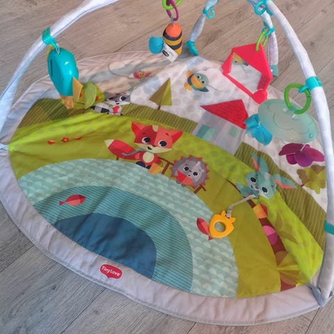 En unik babygym som både kan henge over baby i liggende posisjon, men også legges ned slik at baby kan trene i mageleie. Uglen har en snor som baby kan dra i og uglen lager lyd. Reven kan også bevege seg fra side til side med knapp. Underholder baby lenge.