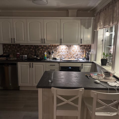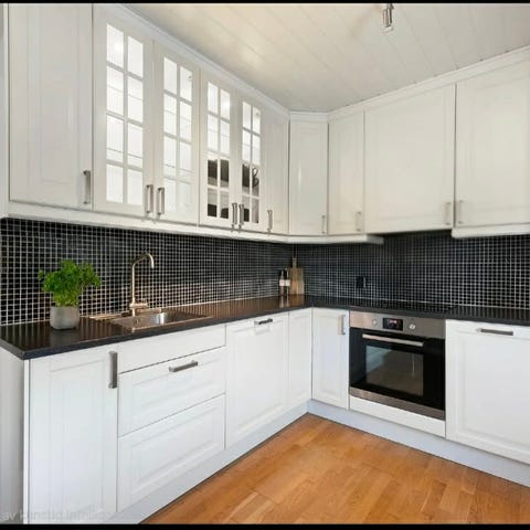 Huseby kjøkken i god stand med integrert oppvaskmaskin og kum/armatur/vifte