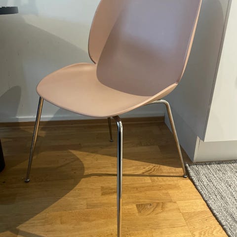 Pene gode stoler, design Søstrene Grene. Stolbein i stål og sete i resirkulerbar hardplast. Noe solbleket i ryggen, ellers hele og pene. Lett å tørke av. Gode å sitte i. Ny pris 599 pr stol.