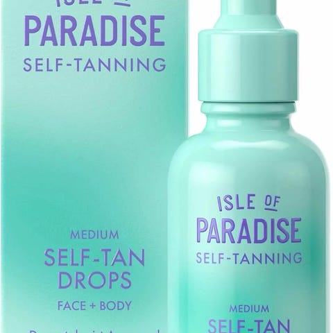 Isle of Paradise selvbruningsprodukter i medium nyanse noe nytt og noe litt brukt. Pakken inneholder Glow Clear selvbruningsskum, selvbruningsdråper/serum for ansikt samt Hyglo Body Self-Tan Serum med hyaluronsyre. Produktene er flytende og i pumpe- eller dråpeflasker, egnet for påføring på kropp og eventuelt ansikt for gradvis eller umiddelbar selvbruning.