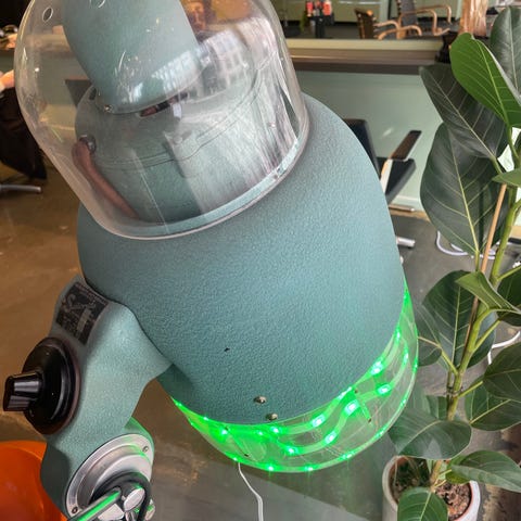 Profesjonell hårtørker med flere varmeelementer montert på justerbart stativ med hjul. Enheten har elektronisk styring med flere innstillinger for varme og tid via kontrollpanel på toppen. Kuppelformet tørkeenhet gir jevn varmefordeling rundt hodet, egnet for bruk i frisørsalong eller lignende profesjonell sammenheng.