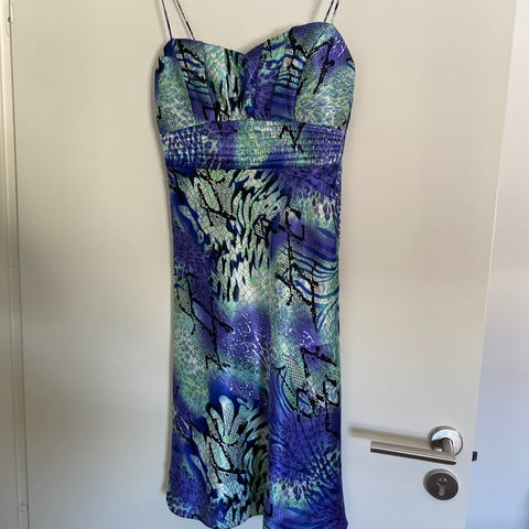 Kjole i flerfarget mønster for dame, størrelse 38 Kjolen har tettsittende fasong med korte ermer og V-utringning foran. Den har strukturert overflate med horisontale rynker og går til omtrent knelengde. Den er foret og sitter veldig fint på kroppen. Ny pris var 2500.