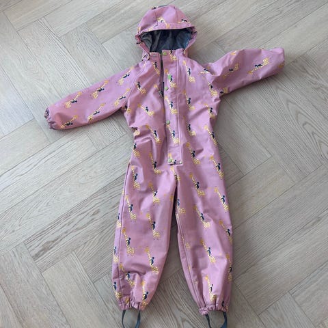 Kattnakken vinterregndress i størrelse 110. Dressen er lilla med dyre- og naturmønster. Materiale i polyester. Modellen er unisex og har hette, glidelås foran med trykknapper, strikk i ermer og ben samt elastikk i livet for bedre passform. Dressen er helt uten skader og har minimalt med bruksmerker. Dressen egner seg godt til bruk på høst og vår, samt mildere vinterdager.