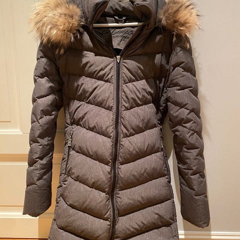 Cedrico Mathe dunjakke, lang parkas for dame i størrelse S. Jakken er fylt med dun (90 % gåsedun / 10 % fjær) med fyllkraft 600. Modellen har avtakbar hette med justerbar snor, toveis glidelås foran og ribbekant i myk bomull ved ermene. Yttermaterialet er vannbestandig, og jakken har en feminin, rett silhuett med horisontale dunkanaler.