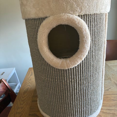 Utsiden er trukket i grått strukturstoff (klorestoff), mens kanter, topp og liggeflate inni er dekket av lys, myk plysj. Inne i huset er det en polstret pute.