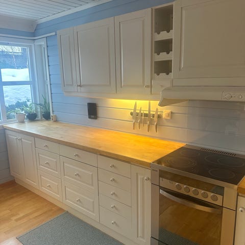 Kjøkkeninnredning i hjørneløsning med hvite skapfronter og mørk laminat benkeplate. Løsningen består av både over- og underskap, inkludert høyskap, hjørneskap og skuffeseksjoner. Skapfrontene har en klassisk profil med rette håndtak i metall. Det følger med benkeplate i laminat og nedfelt dobbel oppvaskkum med blandebatteri. Innredningen passer for et mindre til middels stort kjøkken og gir god skap- og benkeplass langs to vegger. Egnet for montering i tilsvarende romløsning som vist på bildene, eller tilpasset annen planløsning ved ombygging.