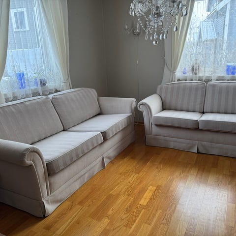 Det er 2 forskjellige merker, men stolene er trukket opp i samme stoff som sofaen.