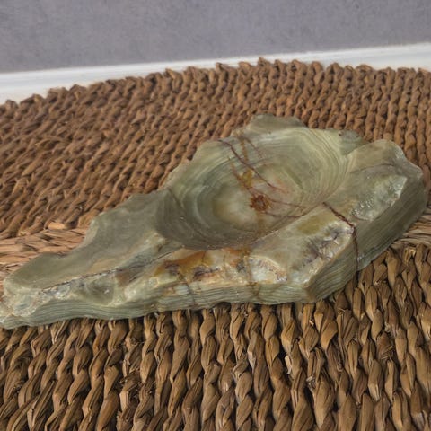 Rektangulært askebeger i keramikk med glasert overflate. Askebegeret har mørk blå kant med håndmalt blomstermotiv i gult og grønt langs sidene, og lys innvendig bunn. Utformet med sigarettstøtter på kantene. Egner seg som askebeger eller som liten skål/dekorasjonsgjenstand på bord eller hylle.