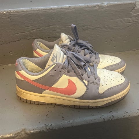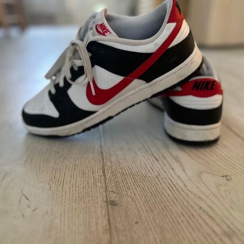 Nike sneakers joggesko i størrelse 39. Skoene har snøring og lav profil. Fargekombinasjon hovedsakelig hvit og mørk blå med røde detaljer og Nike-logo på siden og pløsen. Overdel i syntetisk materiale og tekstil, med perforert tåparti for ventilasjon. Yttersåle i gummi som gir godt grep. Egnet som fritidssko og til hverdagsbruk.