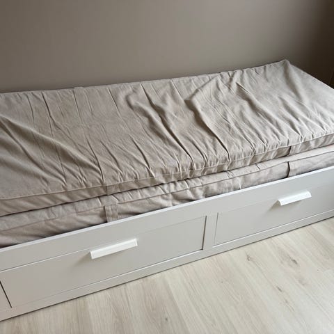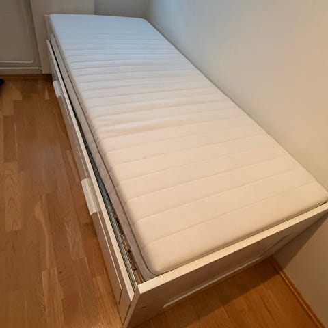 IKEA seng med integrert oppbevaring i form av skuffer og åpen hylle i enden. Sengen er i hvit utførelse og står direkte på gulvet uten synlige bein. Langs den ene langsiden er det flere uttrekksskuffer som kan brukes til oppbevaring av klær, sengetøy eller annet utstyr. I fotenden er det en hylleløsning med åpne hyller som egner seg til bøker, leker eller andre småting. Passer som enkeltseng på soverom, barnerom eller gjesterom der det er behov for ekstra oppbevaringsplass under sengen.