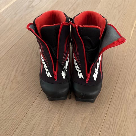 Madshus Raceline JR langrennsstøvler i størrelse 40. Modellen er beregnet for klassisk langrenn og har overdel i syntetisk materiale. Skoene er svarte med røde og hvite detaljer og glidelås i front som dekker lissesystemet. Passer til junior/ungdom og er tilpasset NNN-bindinger (New Nordic Norm), ifølge merkelappen på innsiden av skoen.
