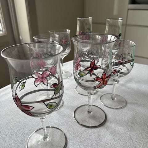 4 nydelige håndmalte tyske Nagel champagne glass. Glassene er 27 cm. høye og er i meget god stand. Ønsker kr. 200,-/ stk. eller bud. Hentes i Tønsberg eller pakkes meget godt og sendes for kr. 100,- inkludert sporing og forsikring