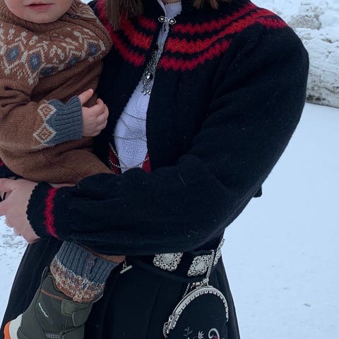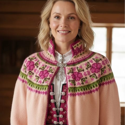 Hjemmestrikket kofte til festdrakt selges ,er oppskrift fra bunad strikk ,bladene på kofta er litt anderledes strikket på denne ,selges for den er for stor ,brukt 3 ganger og ga 2500 for å få noen til å strikke den for meg .