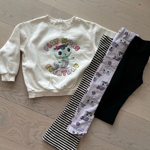 H&M og L.O.G.G. langermede topper for jente i størrelse 110-128. Pakken består av tre topper i ulike farger og mønstre, blant annet ensfargede og stripete varianter. Toppenes materiale er bomull, noe som gir et mykt og behagelig plagg til hverdagsbruk. Den stripete LOGG trøyen er i str 110-116 og de to andre i str 122-128. Passer til jente, men kan også brukes av gutter. Gensrene kan brukes alene eller som lag under andre plagg.