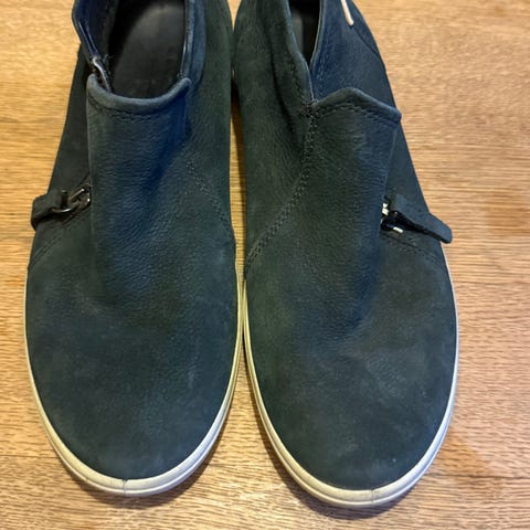 Ecco sneakers joggesko i størrelse 40. Modellen har mørk blå overdel med lyse lisser og detaljer, samt kraftig yttersåle med godt mønster. Passer som hverdagssko eller til lett fritidsbruk. Brukt til uniform på jobb.