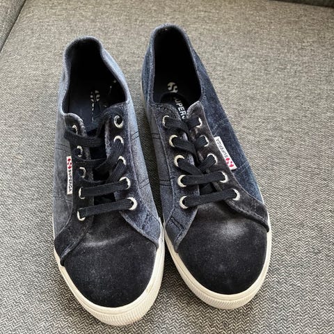 Superga sneakers joggesko i størrelse 37. Jeg er vanligvis skostørrelse 38, men går en størrelse ned i disse. Høy såle. Noen bruksmerker og slitasje, derav lav pris. Kan helt sikkert få bort mye av det med en vask/rens.