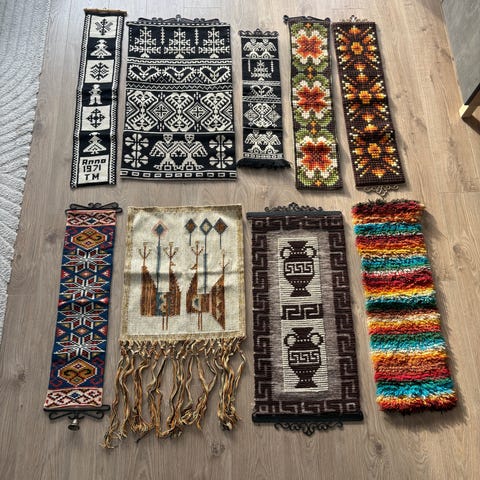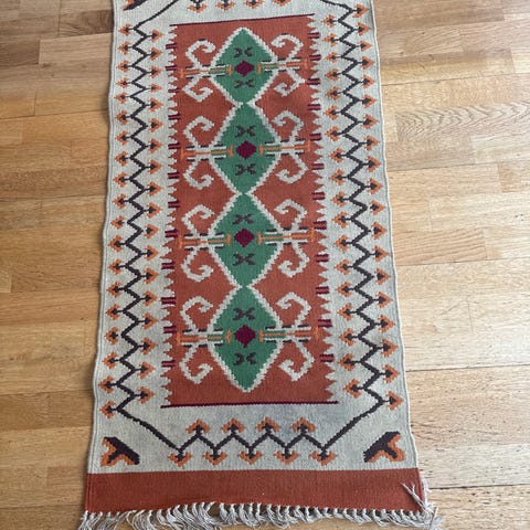 Kan brukes som åklær og henges på vegg, brukes som løpere, eller ligge på gulvet. Allsidige tepper med andre ord! En med de tre bukkene bruse (39 x 104 cm) , og en med antikke amforaer. (37 x 99 cm)