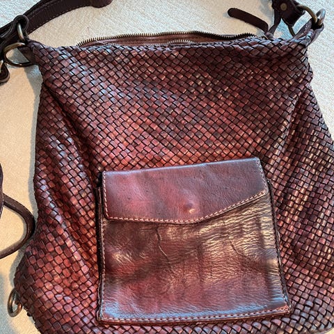 Flott veske i skinn fra Oxford. En lomme utenpå. Flere lommer inni vesken. Lukkes med glidelås.