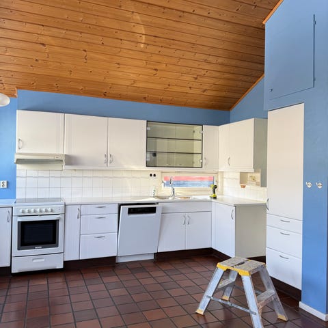 Hvitt kjøkken med overskap, underskap, benkeplate og komfyr