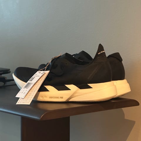 Skostørrelse er 42 3/4. Skoene har vært løpt med i ca 4 km, så framstår som nye. Ny pris; 3.000,- Karbonplate.