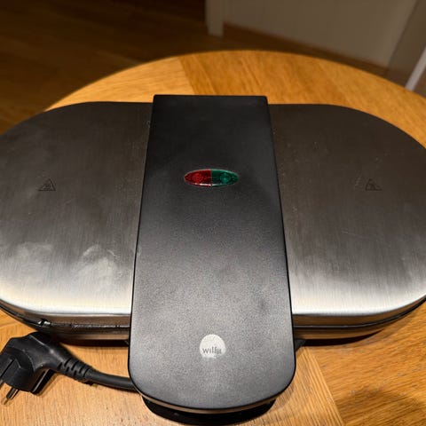 Wilfa vaffeljern i metallutførelse med lokk i rustfritt stål. Elektrisk vaffeljern med kabel og støpsel for vanlig stikkontakt. Egnet til steking av vafler på kjøkkenbenk. Enkelt design med håndtak og indikatorlampe på fronten.