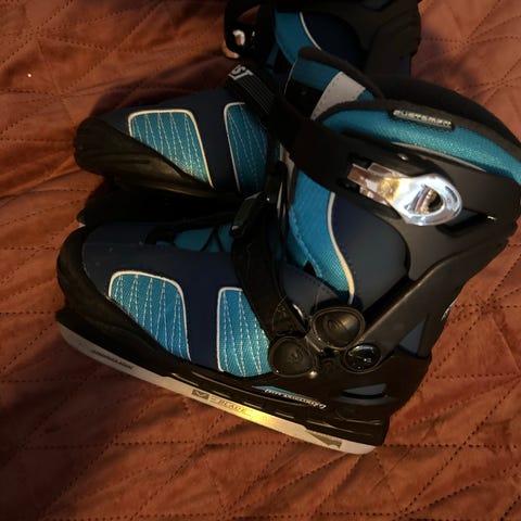 ishockeyskøyter for barn i justerbare str. Skøytene har justerbar yttersko med plastskall og polstret innersko for bedre støtte og komfort. Fargekombinasjon blå og svart med detaljer i hvitt. Lukkes med spenner og borrelås for enkel tilpasning. Egnet til ishockey og generell skøytebruk for barn på is.