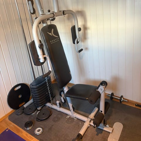 Selger treningsapparat med benkpress/vekter.