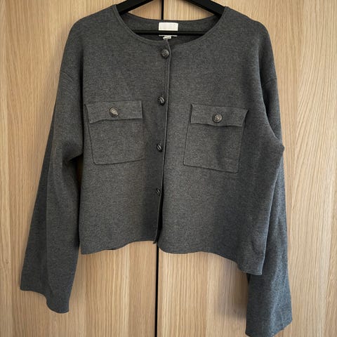 Pent brukt jakke/ cardigan i mørk grå fra Zara i 100% ull. Noe nupper, men kan enkelt fjernes med nuppefjerner.