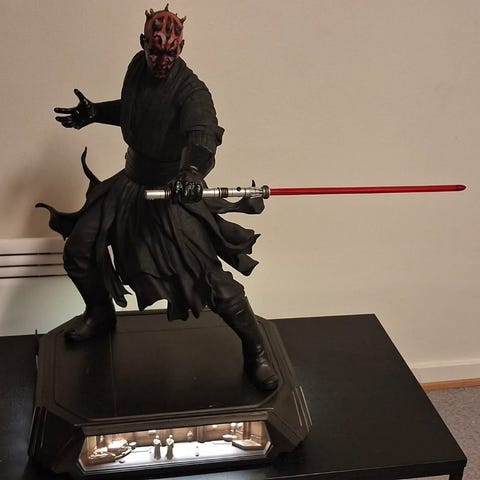Star Wars Kylo Ren actionfigur i svart. Figuren forestiller karakteren Kylo Ren med sort drakt og hette, samt rød lyssabel. Egnet som leke eller samlefigur for Star Wars-universet. Kan plasseres stående på hylle eller skrivebord som dekorasjon eller i samling med andre figurer fra samme serie.
