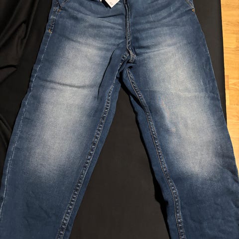 H&M bukse for gutt i størrelse 146. Buksen er i blå bomull og har elastisk linning og mansjetter nederst på bena. Den har for- og baklommer og er egnet til hverdagsbruk.