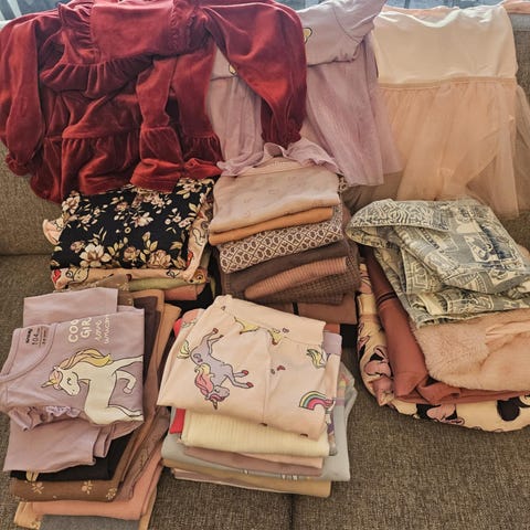 Jente barnehage klær i størrelse 98 i hovedsak i rosa fargetoner. Pakken inneholder ulike plagg som passer til hverdag og barnehagebruk, blant annet gensere, bukser og ytterplagg. Klærne er tilpasset jente i størrelse 98 og har ulike nyanser av rosa og mønstrede detaljer. Egnet for bruk gjennom store deler av året, avhengig av lagvis påkledning.