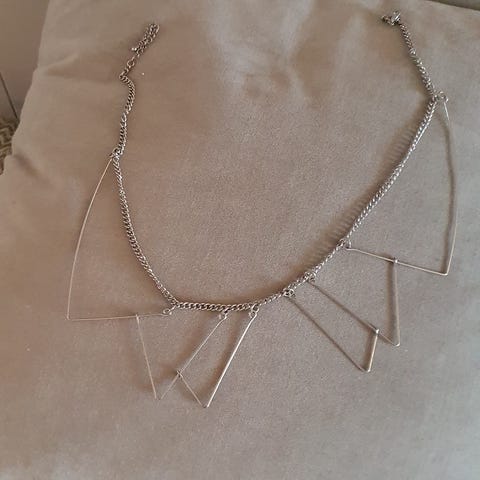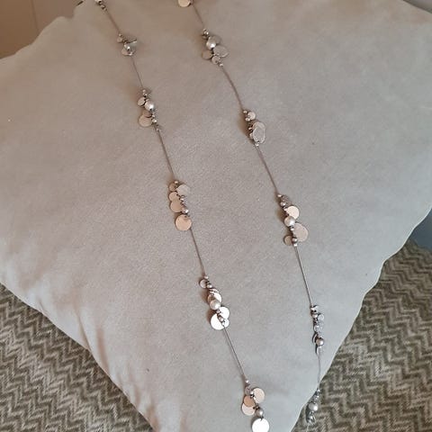 Halskjede for dame med flere tvinnede remser i sølvfarget metallutseende. Smykket består av mange små kulerader som danner et bredt kjede. Det har regulerbar forlengerlenke og lukkes med karabinlås. Passer som tilbehør til både hverdags- og penere antrekk.