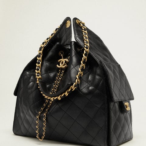 Chanel skinnveske for dame i beige lær. Vesken har quiltet mønster og gullfarget metall-detaljer, inkludert kjedestropp og CC-logo. Åpning med snøring gjennom metallmaljer. Utvendig lomme med klaff og vrilås med CC-logo. Rektangulær bunn med quiltet søm gir struktur. Egnet som hverdagsveske eller til penere anledninger.