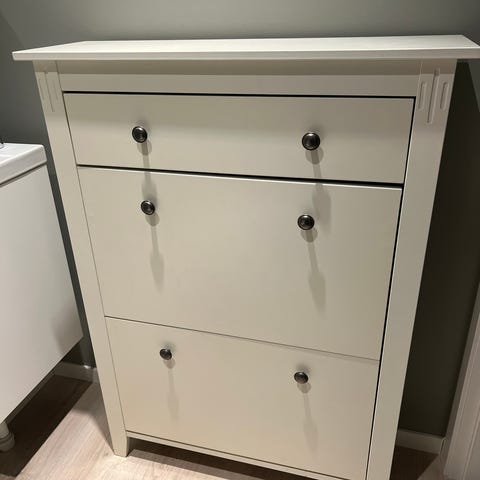 Selger skoskap. Skuffer fungerer godt. Ene foten har litt bruksmerker.