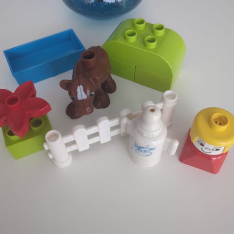 L621; DuploPakke m Baby-duplo: Blekksprut m myke ben, raslebie, Vogn m kloss, vippeleke m kuler så den kan kjøre og snurre. 150kr