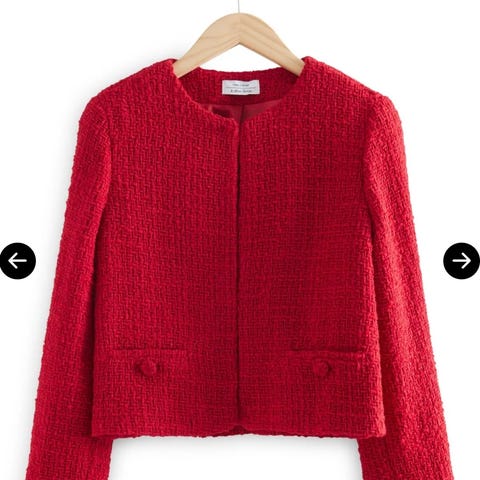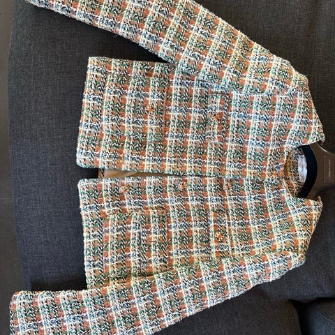 & Other Stories jakke i flerfarget vevd stoff i størrelse M. Jakken er laget i polyester og har en kort, rett passform med rund hals. Den har lange ermer og knappelukking foran. Modellen passer til dame og kan brukes som en lett ytterjakke eller som et lag over topper og kjoler.