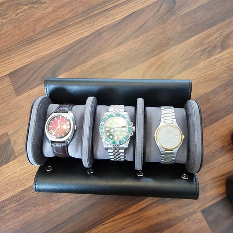 Selger klokkeboks / Klokkerull i svart skinn. Som ny.