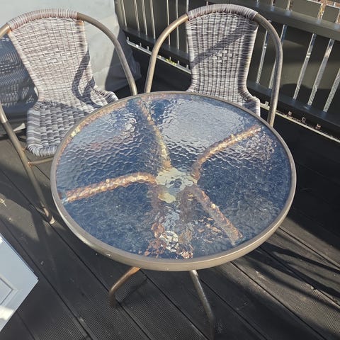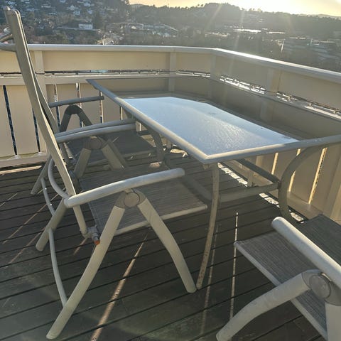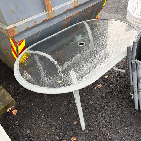Hagebord med glassplate og 4 stoler metall rotting