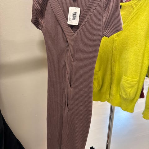 AMISU hverdagskjole for dame i størrelse 36. Kjolen er brun og laget i viskose. Den har ribbestrikket struktur og dyp V-hals, med lange ermer. Egnet som hverdagskjole.