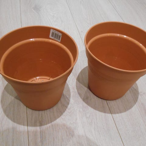 Palmeplante i potte med lange, grønne fjærformede blader. Planten står i en enkel, mørk plastpotte.